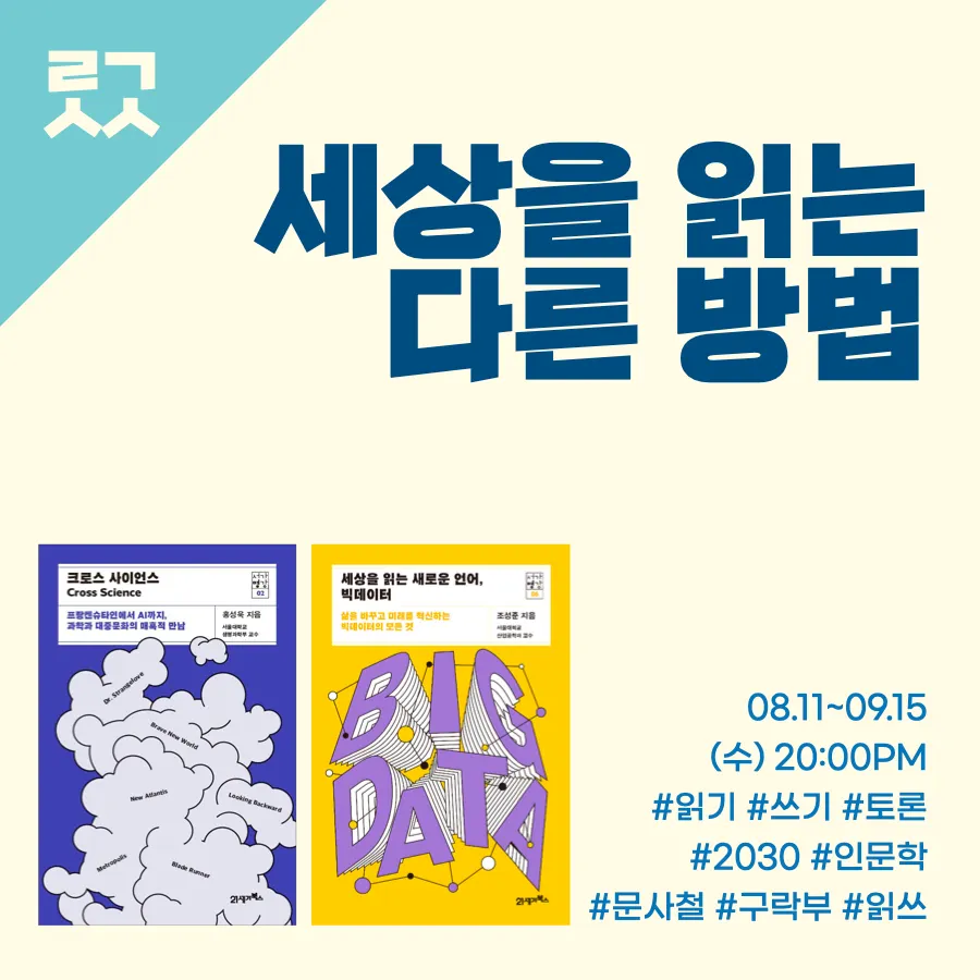 과학기술의 발전은 우리 삶을 크게 바꾸어 놓았습니다. 손 안의 작은 세계, 스마트폰이야말로 그 대표적인 예 아닐까요. 스마트폰 없는 세상은 상상하기 힘들 정도입니다. 이제 과학기술에 대한 이해 없이 우리 사회를 이해하는 것은 불가능할 정도가 되었습니다. 우리는 두 권의 책, <크로스 사이언스>와 <세상을 읽는 새로운 언어, 빅데이터>를 읽으며 과학과 기술에 대한 여러 이야기를 나눕니다. 과학이 던진 새로운 질문, 빅데이터와 인공지능(AI)이 열어줄 미래의 모습까지 조금 다른 눈으로 오늘과 내일을 생각해봅시다.