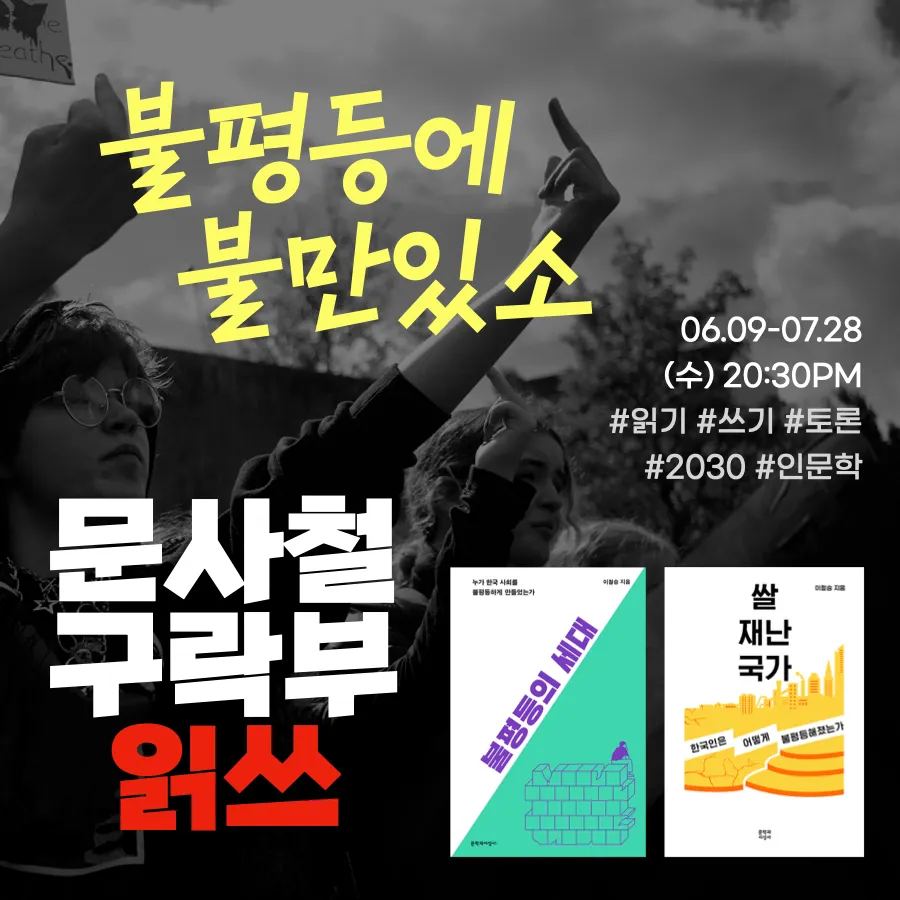 한국 사회의 불평등을 이야기하는 이철승 선생의 문제적 저작을 읽으며 생각을 모아봅시다. <불평등의 세대>에서는 세대간 불평등이 형성된 과정을, <쌀 재난 국가>에서는 이 불평등을 재생산하는 역사 문화적인 구조를 비판적으로 살펴볼 예정이예요. 어쩌다 우리는 이렇게 불평등하게 되었나. 불만을 넘어 변화의 가능성을 탐구해봅시다.