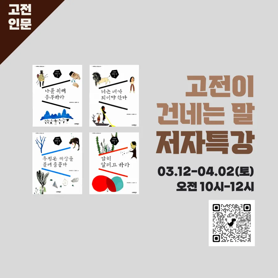 시간이 흘러도 씻겨나가지 않는 말이 있습니다. 비바람이 불어도 시간의 풍화를 맞지 않는 책이 있습니다. 우리는 이 책을 ‘고전'이라 부릅니다. 천 년이 넘는 시간을 건너와 우리에게 생생하게 말을 건네는 책을 만나봅시다. 배움에 대해, 진리에 대해, 역사에 대해, 고통에 대해 각각의 성찰을 담은 책을 읽습니다. 공자와 장자, 사마천과 욥이 우리가 만날 인물입니다. 천 년을 건너온 이들의 목소리에 귀 기울여 봅시다.